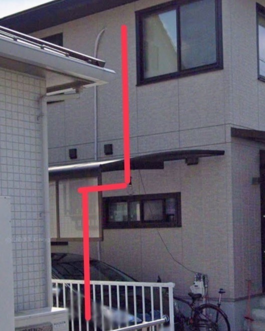 - 窓から顔出したら、エアコンの冷媒配管はカーポートと外壁の狭い隙間から1階までテープ巻きで降りています。