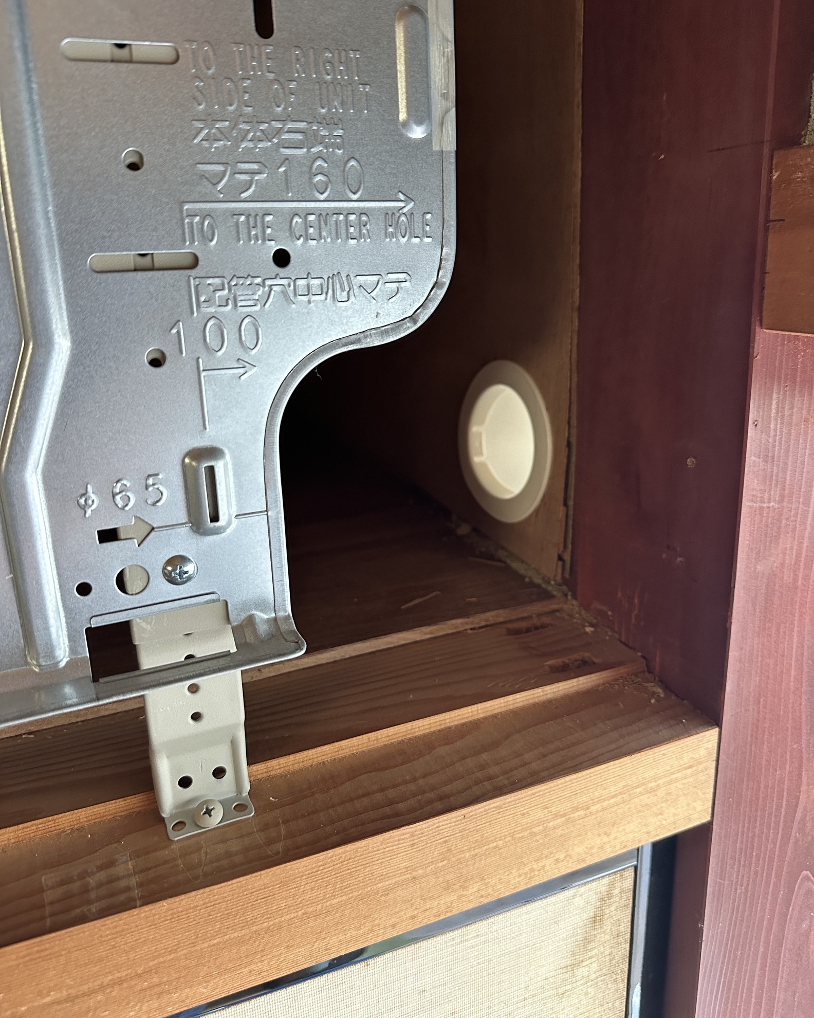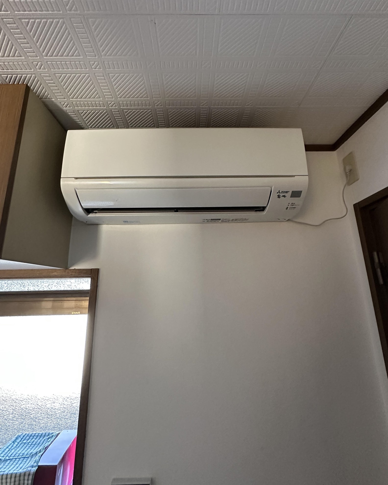 - この台何処に三菱電気のエアコン2.2kw取り付けて有って、写真では右に有るドアが開けるとエアコンに当たります、それで別の和室に移設する方向に。