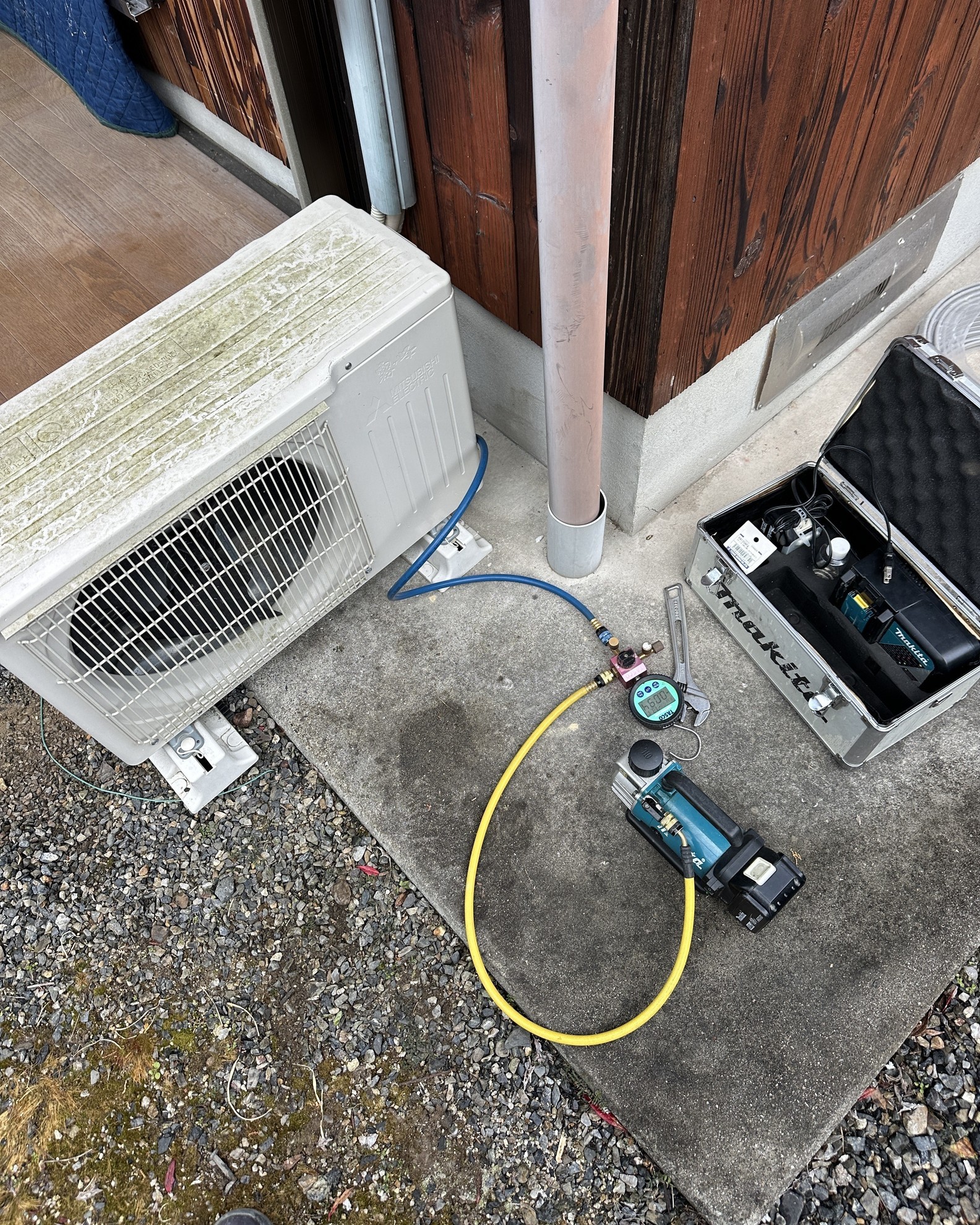 - このエアコンの移設は冷媒配管の再利用していますから、長さが足りず室外機はこのレイアウトに。