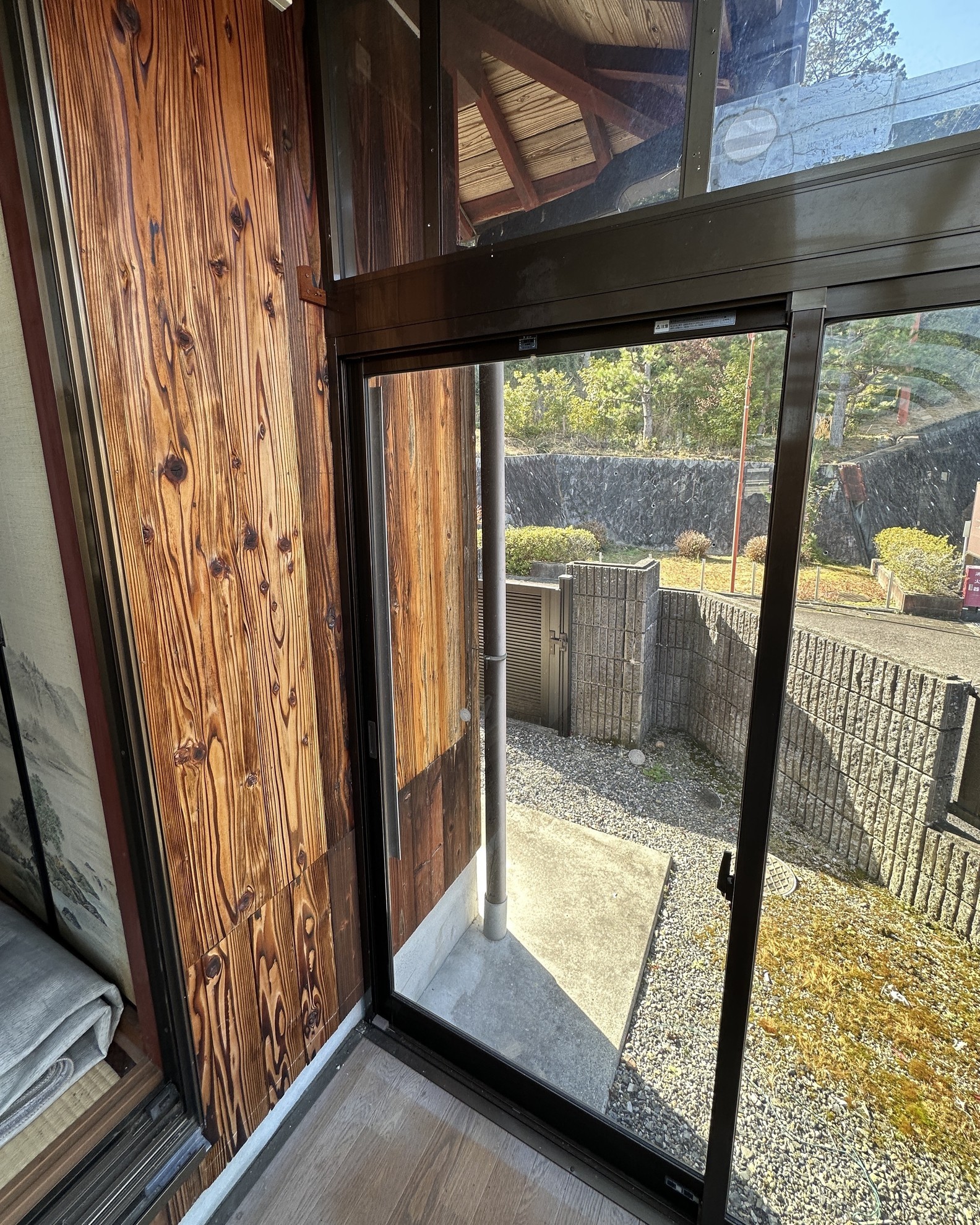 - エアコンの穴開けした後は、表側はサンルームの中ですから、