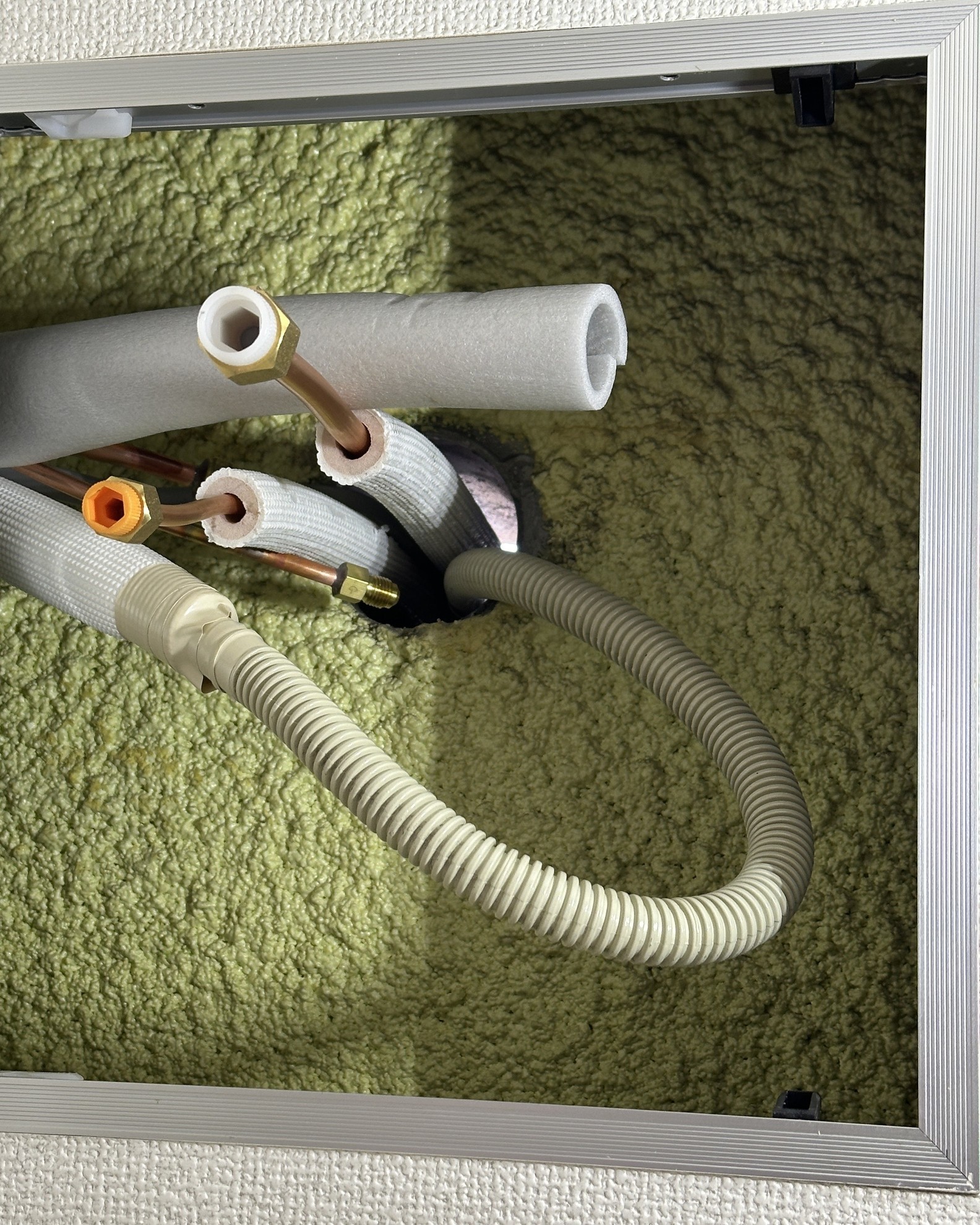 - 配管は室内機の右横から出て、写真で見える点検口の中で接続をします。