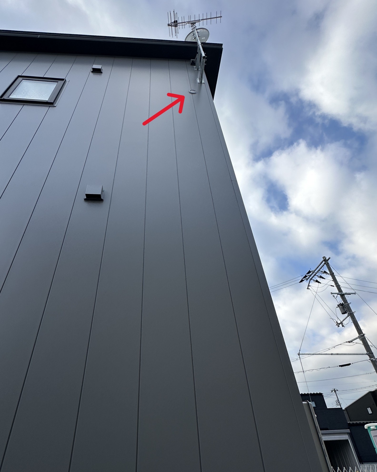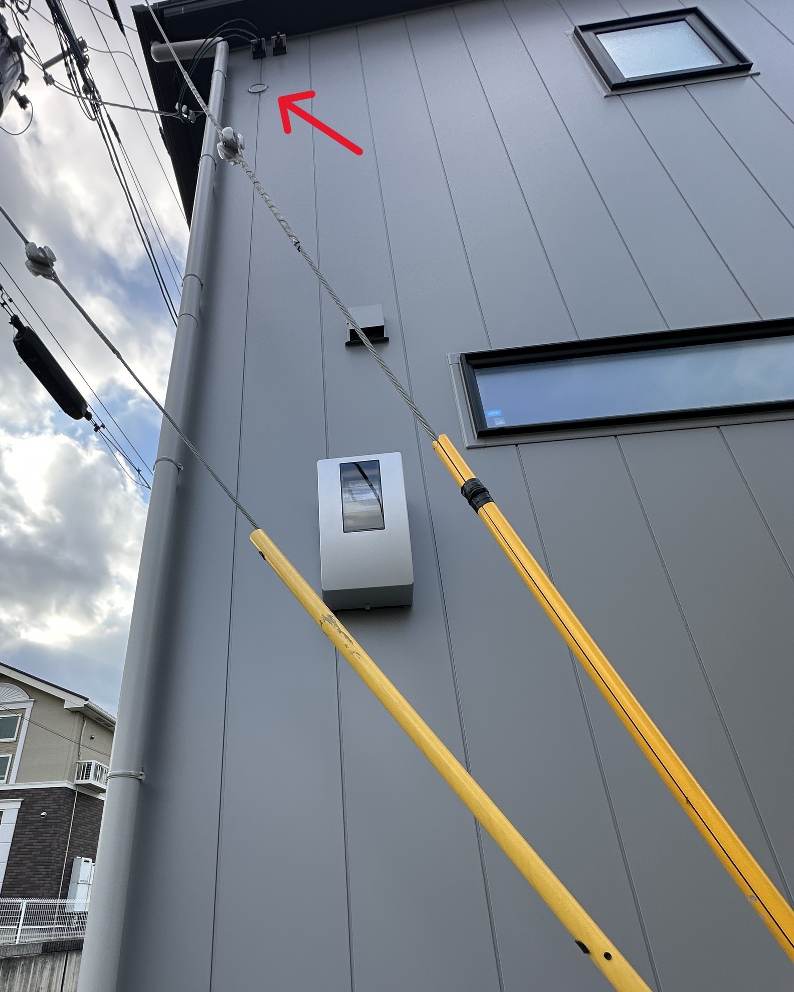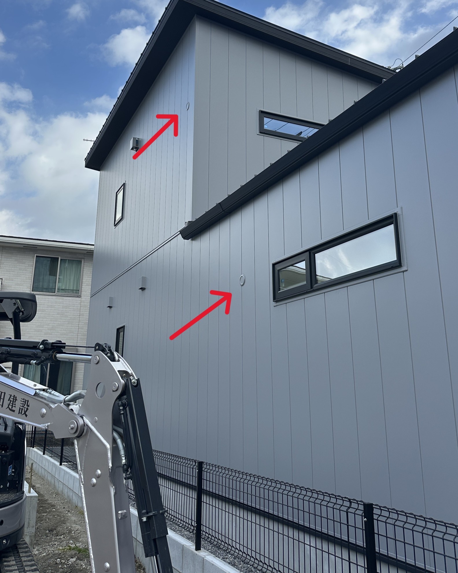 - M様に、この先隣の家も建ててたら、狭い通路だからエアコン入れ替えの時の現状説明して、今のうちに、まだフェンス取り付けていない為、2階の部屋の室内機の穴が左後ろだけに隠ぺい配管工法で施工したらどうですか?って、