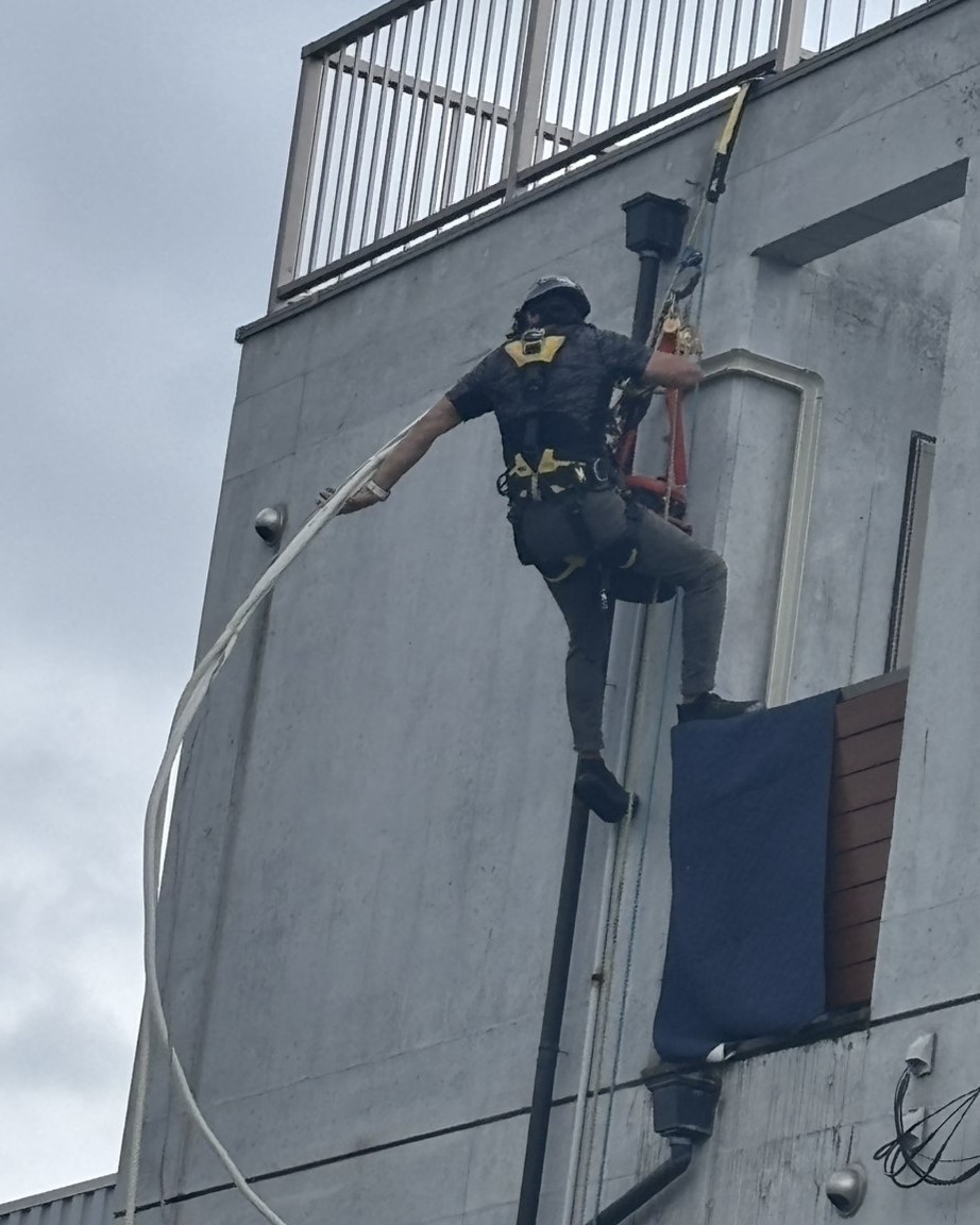 ロープアクセスの高所作業中