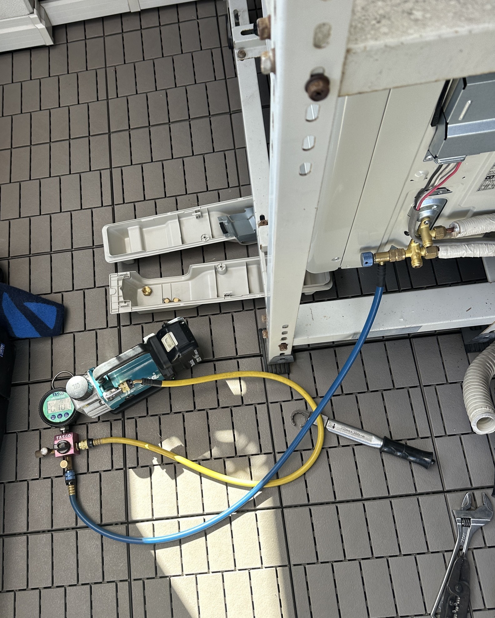 - この写真では、上の室外機の真空引き15分。