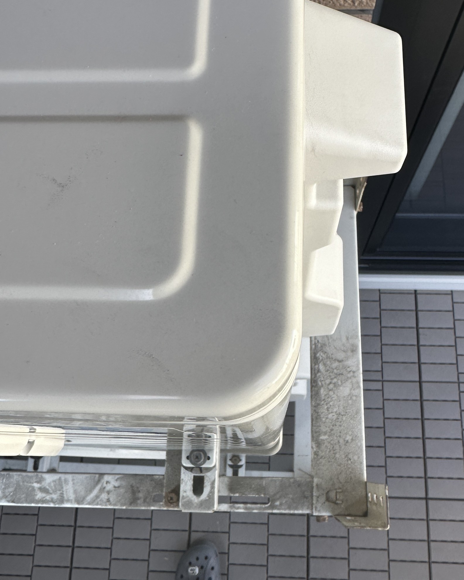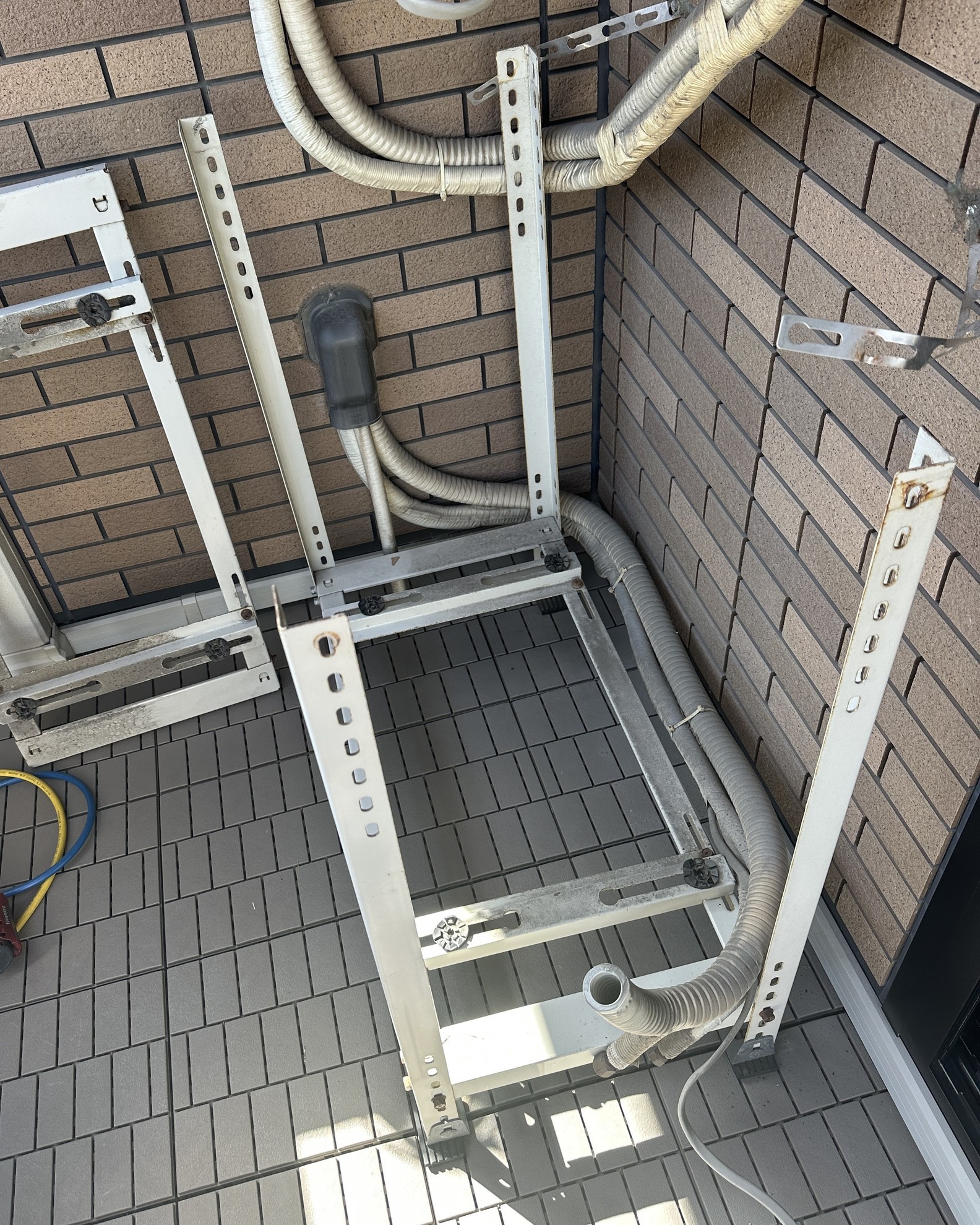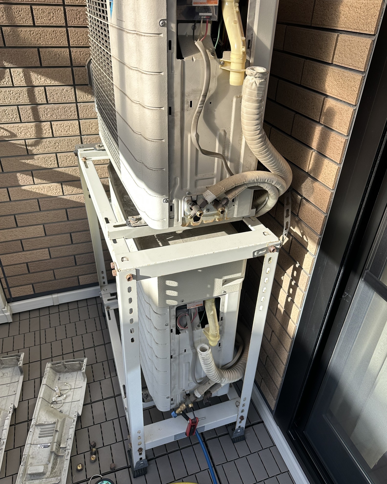 - 2階寝室のベランダにうるるさららの室外機、2段置き架台で設置。