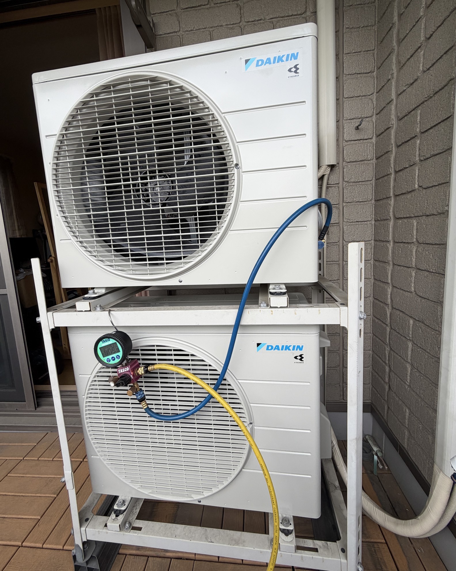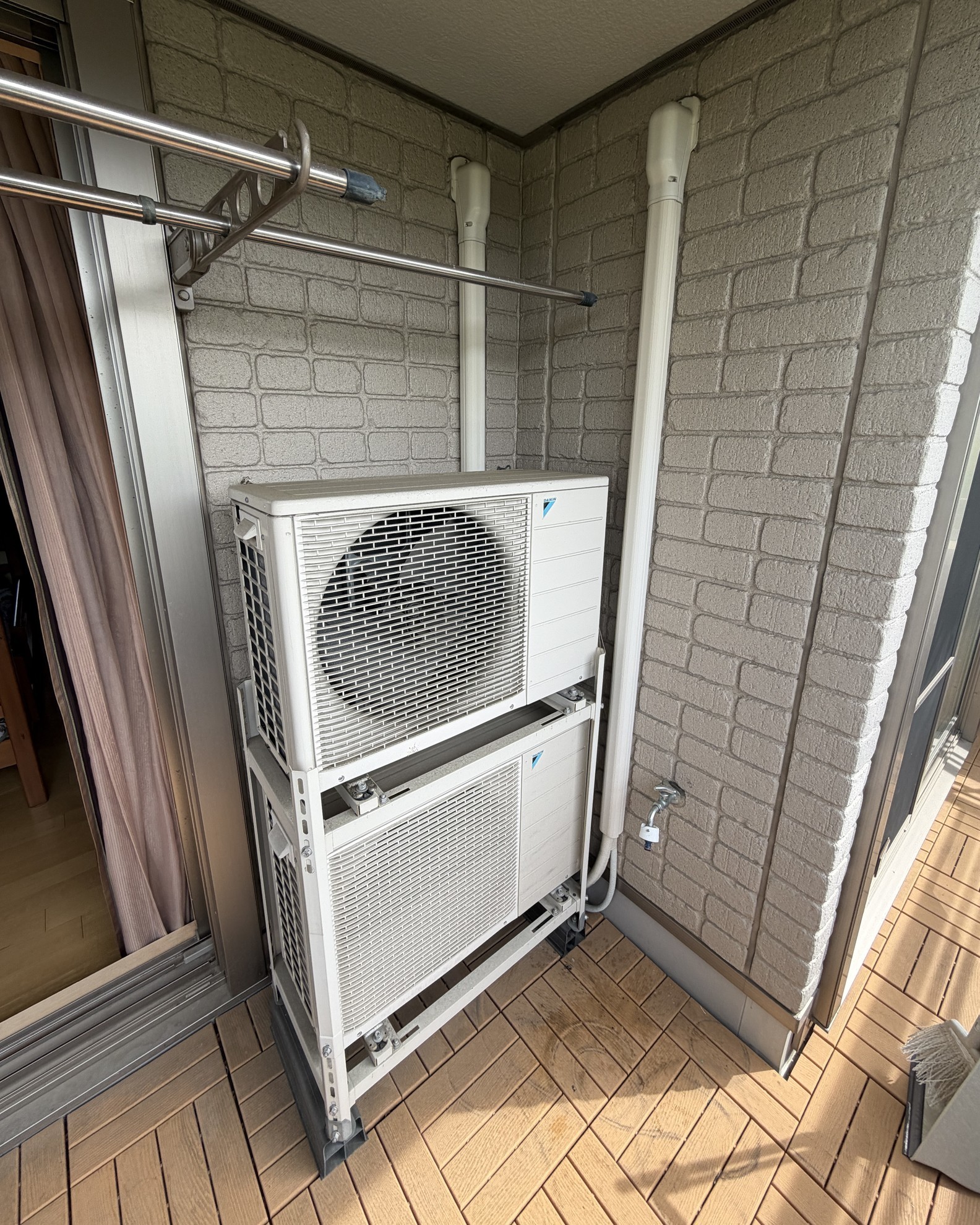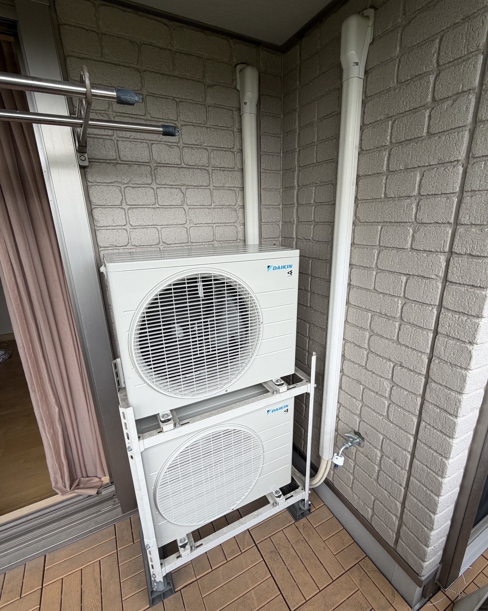 「積水ハウス住宅にて、2階の2部屋のエアコンを入れ替え、室外機はベランダの2段置き架台に設置しました。」