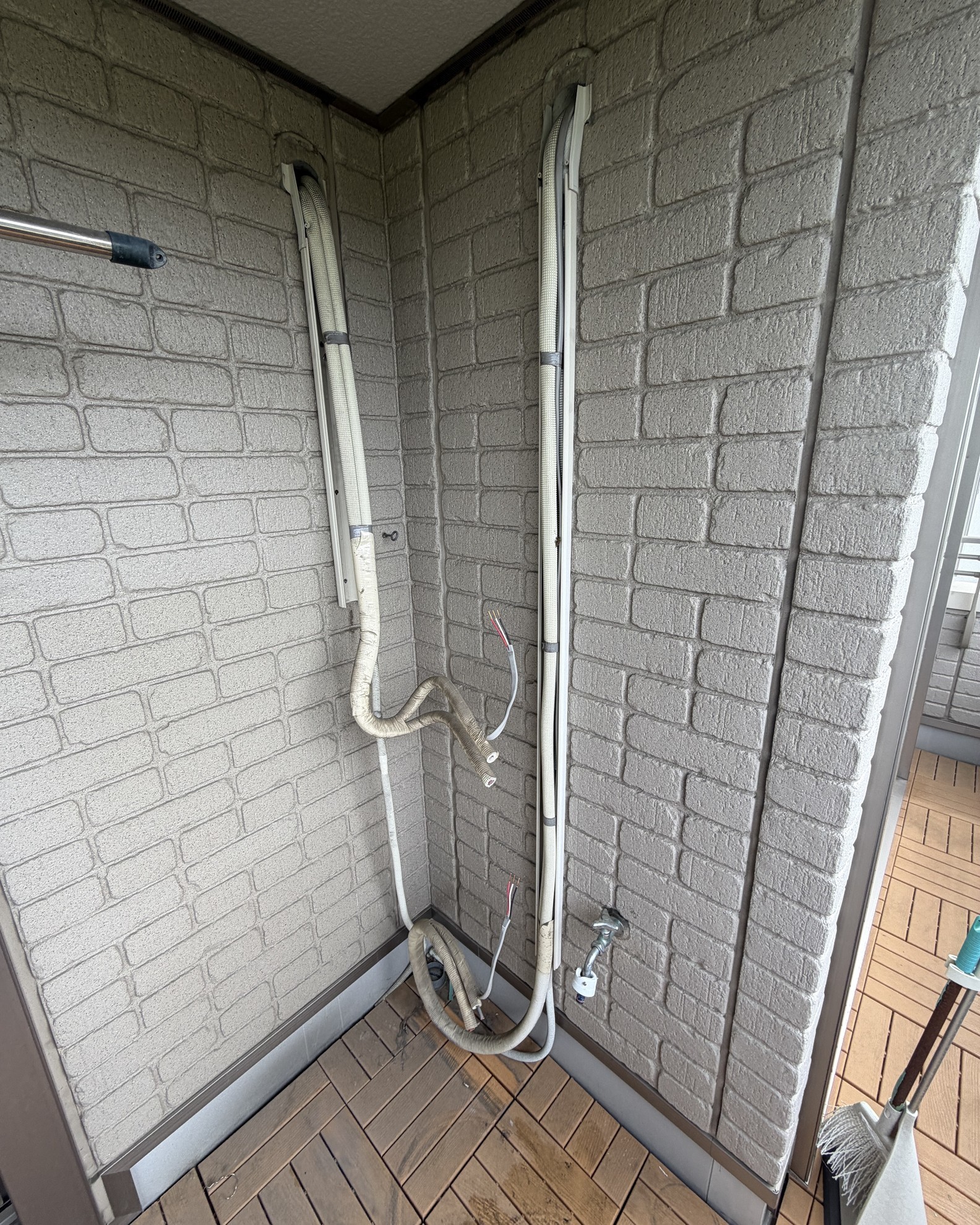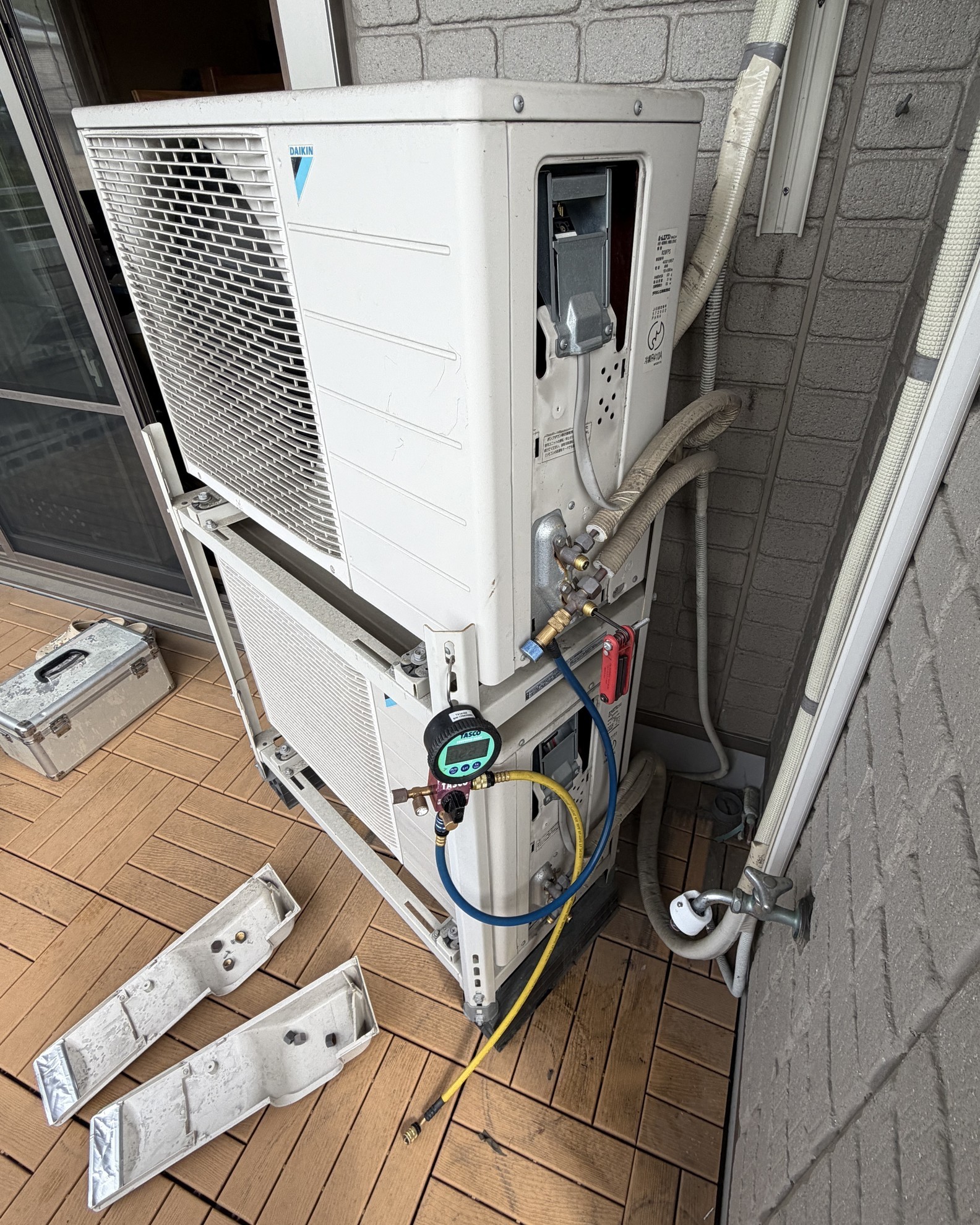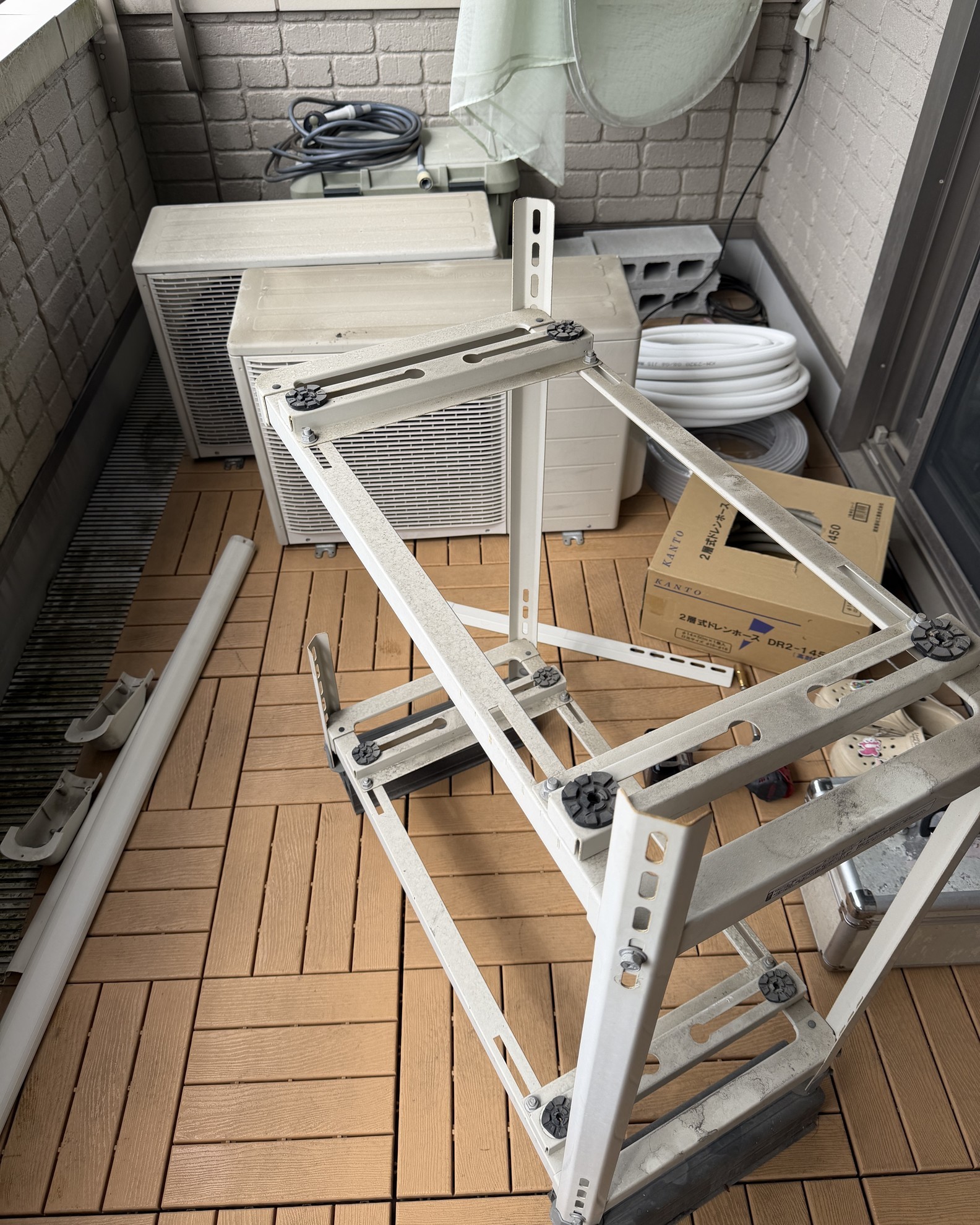 「積水ハウス住宅にて、2階の2部屋のエアコンを入れ替え、室外機はベランダの2段置き架台に設置しました。」