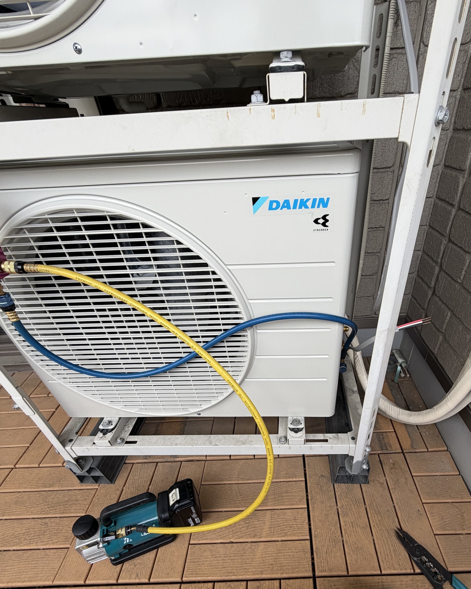 - この写真では室外機の取り付け後、洋室①のエアコンの真空引き15分。